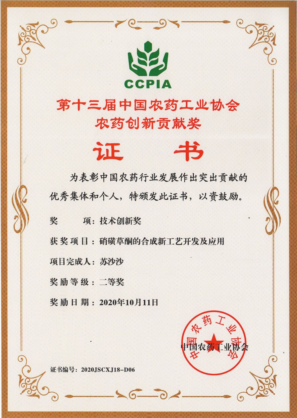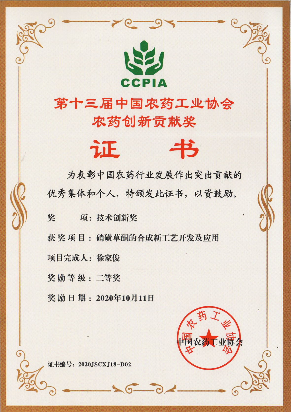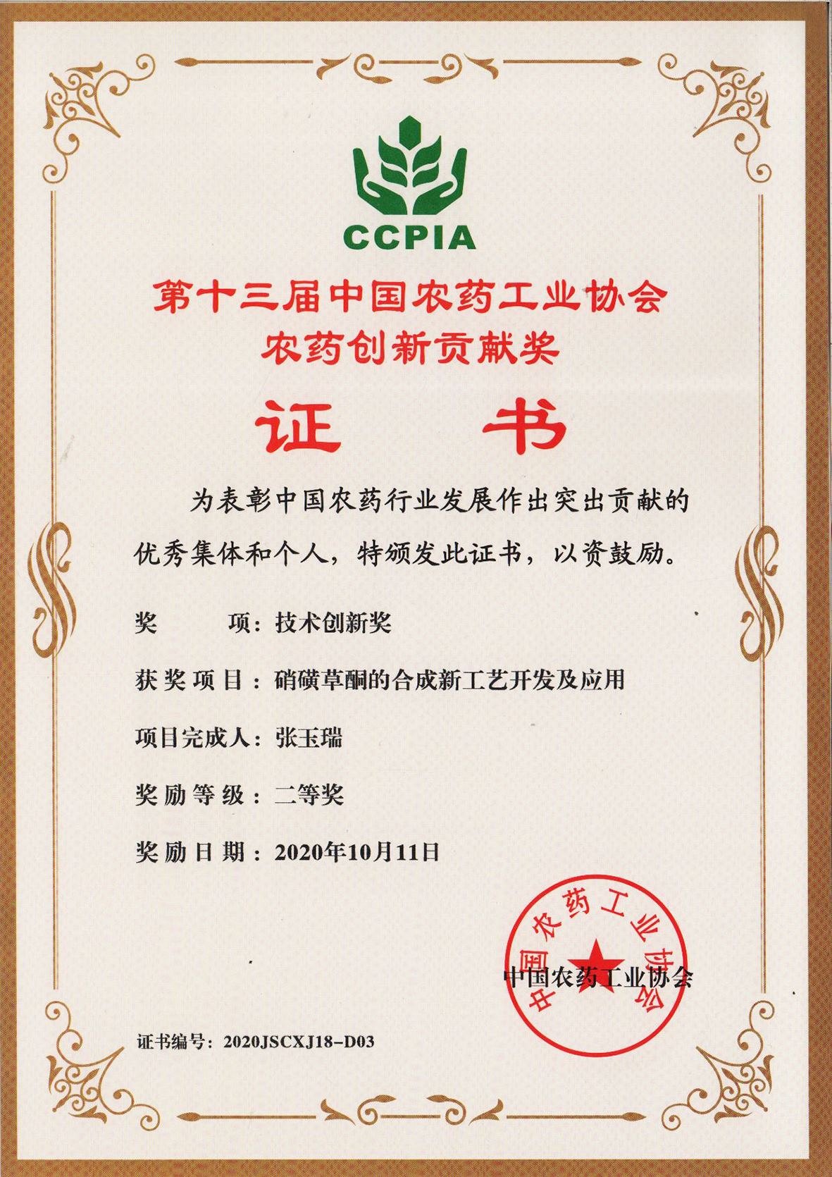 ■2020-11-05 我公司“硝磺草酮的合成新工藝開發(fā)及應(yīng)用”項(xiàng)目榮獲技術(shù)創(chuàng)新獎(jiǎng)