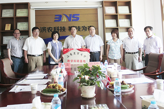 5月30日,濱農(nóng)科技與山東農(nóng)業(yè)大學(xué)獎(jiǎng)學(xué)金合作暨教學(xué)科研基地揭牌儀式在我公司二樓會(huì)議室舉行。山東農(nóng)業(yè)大學(xué)副校長(zhǎng)車(chē)先禮、教務(wù)處副處長(zhǎng)尚太玲、學(xué)工處副處長(zhǎng)韓同吉、植保學(xué)院黨委書(shū)記董厚奎、植保學(xué)院副院長(zhǎng)王金信、植保團(tuán)委副書(shū)記王小東一行來(lái)我公司參觀交流并簽署合作協(xié)議。山農(nóng)教務(wù)處副處長(zhǎng)尚太玲、我公司董事長(zhǎng)黃延昌分別代表雙方簽署合作協(xié)議,濱州市政協(xié)副主席、民建濱州市委主委吳國(guó)瑞為科研基地揭牌。